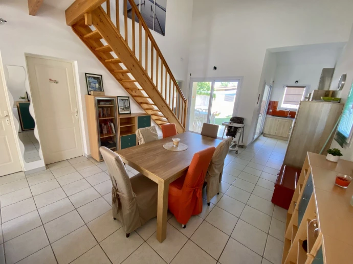 Dotée de 3 chambres dont une en mezzanine, un séjour avec cuisine ouverte, deux terrasses abritées et un parking, elle peut accueillir jusqu'à 8 personnes.